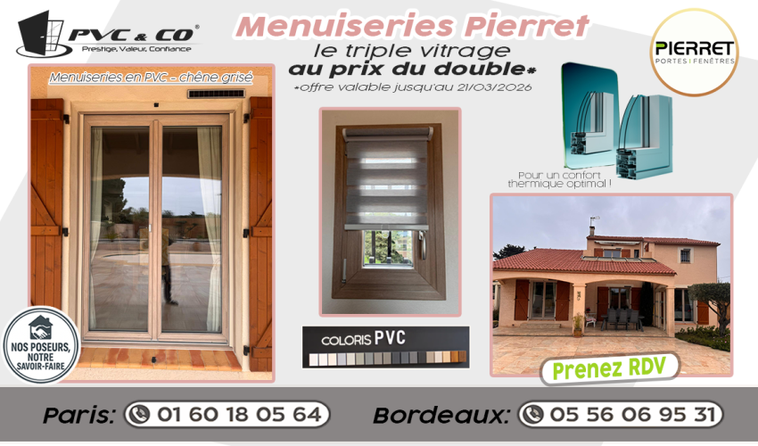 Optez pour nos menuiseries PVC triple vitrage Pierret et bénéficiez de l’offre du moment : le triple vitrage au prix du double.