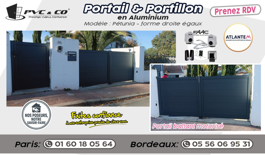 đ§âšFourniture et pose dâun portail aluminium AtlanteM Ă deux vantaux, motorisĂ© avec un kit FAAC, accompagnĂ©e de son portillon assorti.