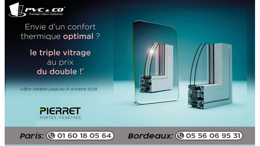 Ne laissez pas passer cette opportunité ! Chez Pierret, le triple vitrage est au prix du double, mais seulement jusqu’au 31 octobre 2025. Besoin d’un devis ou d’un conseil ? Contactez-nous dès maintenant ! L’équipe, PVC & CO